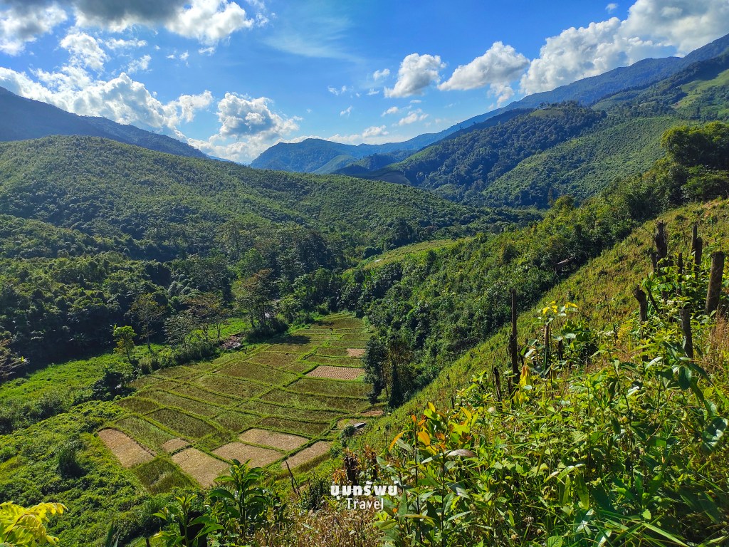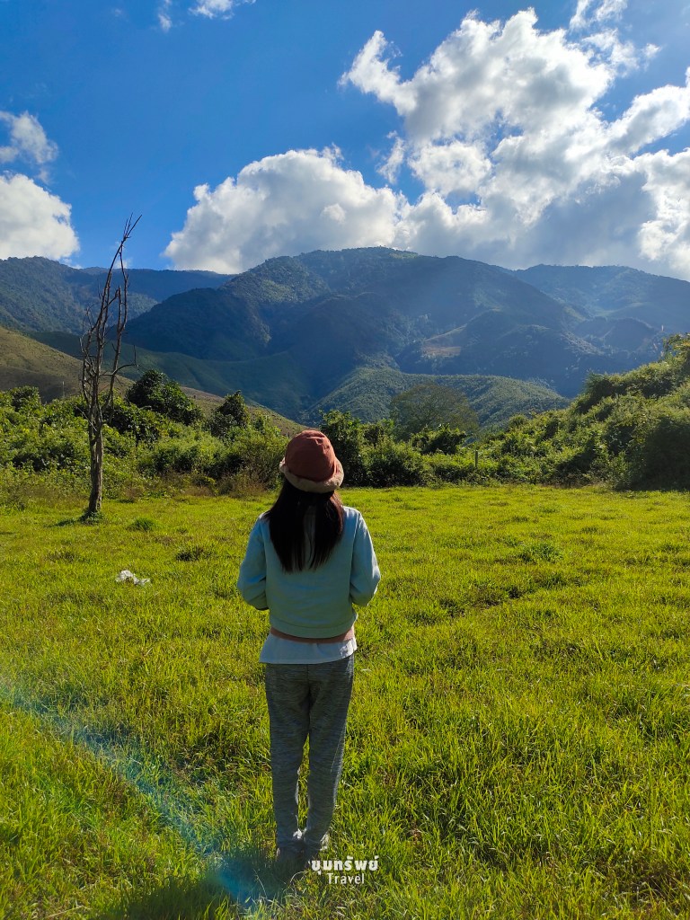 เดินลงจากภูเขาที่มีที่พัก “หมอกธารฟ้าภูนาดาว ฟาร์มสเตย์แอนด์แกลมปิ้ง” อยู่บนภูเขาลูกนั้นอย่างชิลๆ แต่เมื่อมองกลับไป เราก็เดินมาไกลเหมือนกันนะ ตอนเดินกลับที่พักน่าจะเหนื่อย 55555