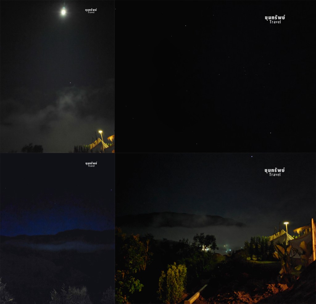 บรรยากาศยามค่ำคืน ที่สามารถมองเห็นทะเลหมอก แสงจันทร์ และดวงดาวบนท้องฟ้า