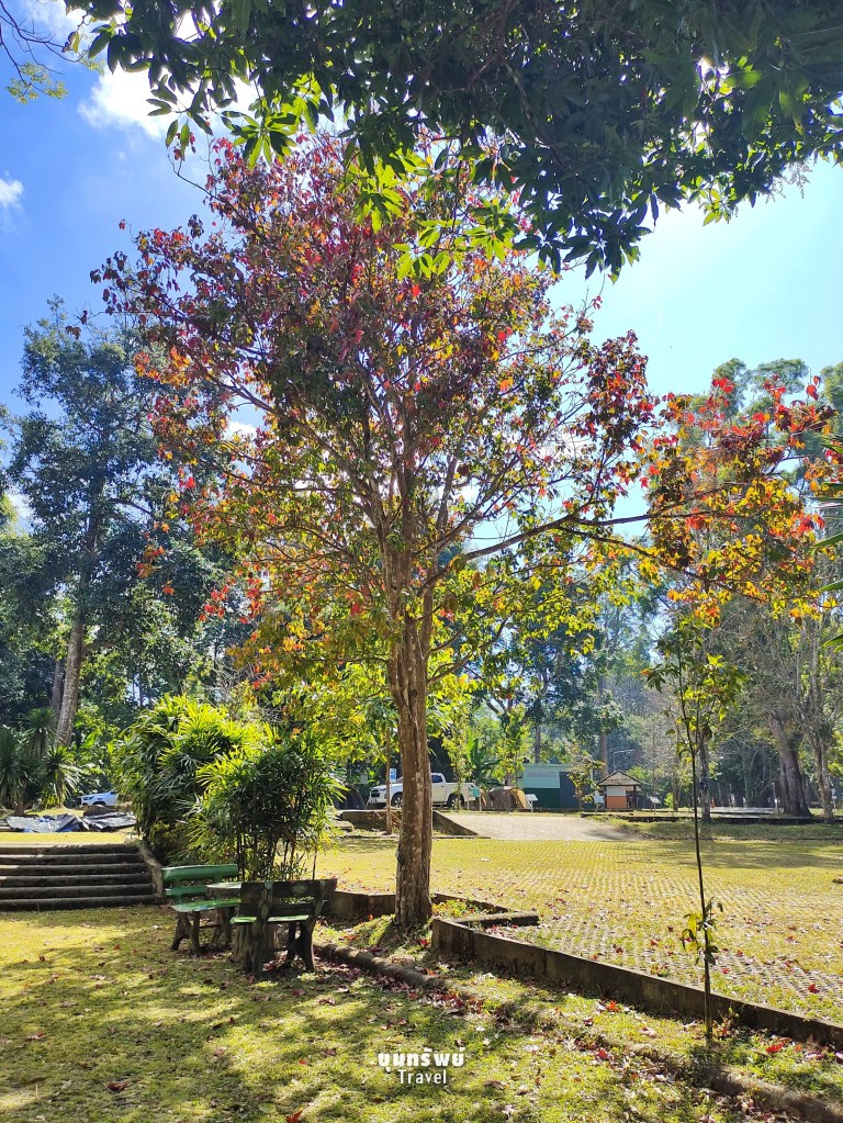 บริเวณโซนร้านอาหาร ใกล้กับ “ครัวคุณริน” ที่อุทยานแห่งชาติภูหินร่องกล้า จ.พิษณุโลก พบต้นก่วมแดง (เมเปิ้ล) ผลัดใบเปลี่ยนเป็นสีแดงเต็มต้น
